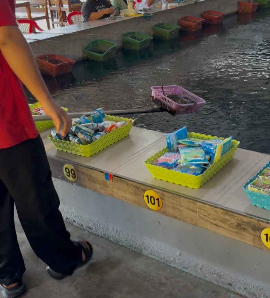 釣り台にお菓子が置いてあって、そのお菓子に書かれた数字とエビの重さが一致していたら、そのお菓子がもらえるんです。6匹中1匹がビンゴで、お菓子もゲットできました🙌